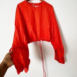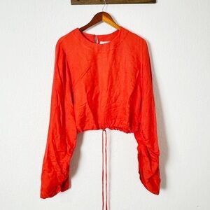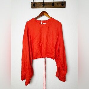 crafted in a lightweight viscose blend. Featuring a high scoop neck, long cocoon sleeves with an adjustable drawstring, this relaxed fit top can be worn loose at the hip or cropped to the waist.