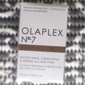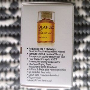 OLAPLEX No.7 Bonding Hair Oil is a highly concentrated, weightless reparative styling oil. It significantly enhances shine and softness while maintaining color vibrancy. This oil also minimizes flyaways and frizz and provides heat protection up to 450°F (232°C).