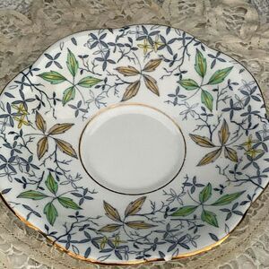 Beautiful British made Taylor & Kent Longton bone china tea cup and saucer duo in a rare botanical leaf pattern of greens, tan and golds. The makers mark dates to 1939-1949, the factory was closed during WWII