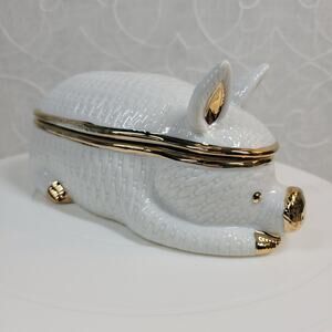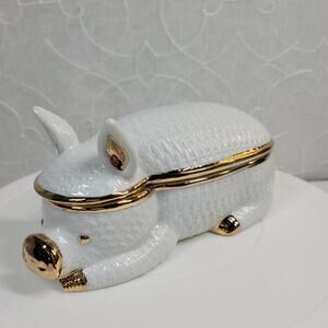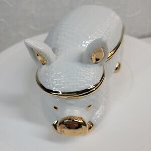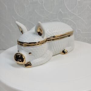 Vintage Bone China Porcelain Pig Hinged Trinket Jewelry Box w/ 18k Gold Accent