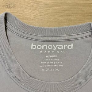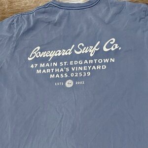 Authentic Boneyard Surf Co. t-shirt from the iconic surf shop on Main Street in Edgartown, Martha’s Vineyard. Super soft and broken-in with that perfect vintage boutique feel. Classic logo on the front and full shop branding on the back. Unisex medium, 100% cotton. Great for beach days, summer adventures, or casual everyday wear. From a beloved local brand established in 2002.