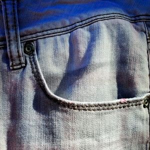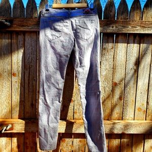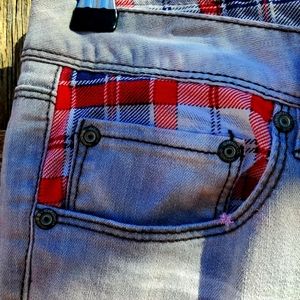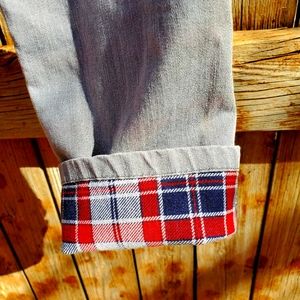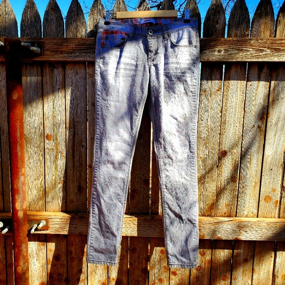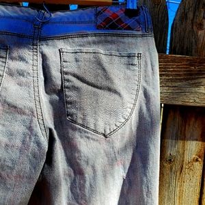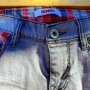 Y2K Bongo jeans. 99% cotton and 1% spandex. Size 5. Steel grey. Distressed. Red, navy blue, grey plaid lining. 5 pockets. Zipper closure. Skinny leg. In beautiful condition! ♡