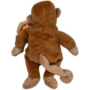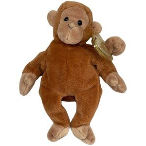 Adorable TY brown monkey plush toy, perfect for kids. Soft and cuddly, this toy is a delightful companion for playtime. Ty Beanie Baby named Bongo the Monkey. Bongo is a plush toy with brown fur, lighter brown hands, feet, ears, and face, and black button eyes. It has a tag attached to its ear, indicating it is a part of the Ty Beanie Babies collection. Bongo was first introduced on August 17, 1995. It is considered a vintage and collectible item, particularly versions with tag errors or those from early production runs.