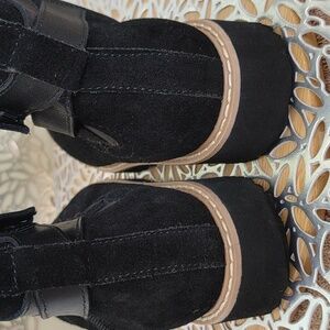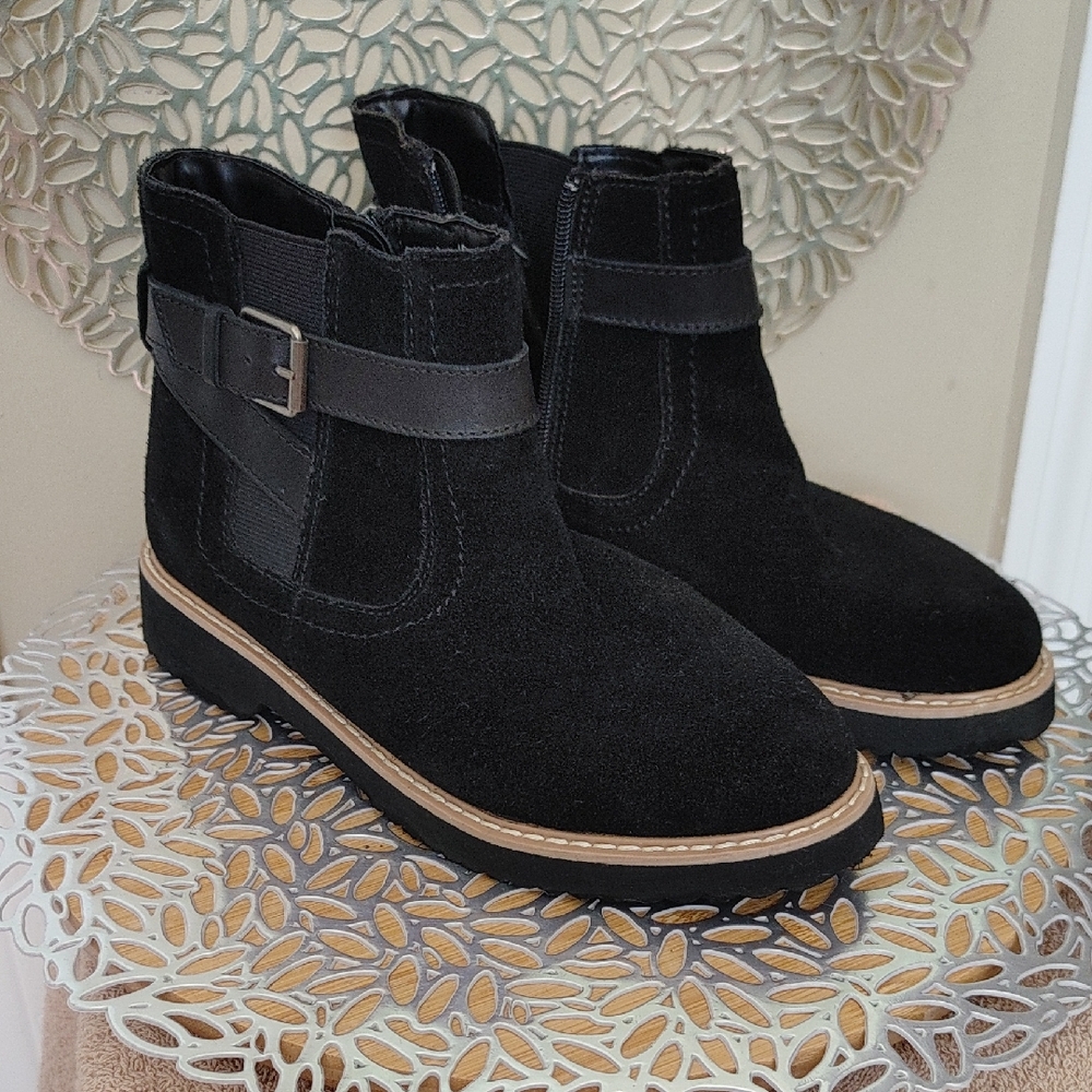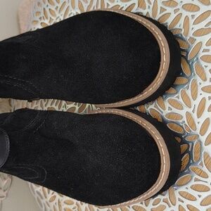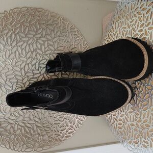 Black suede-like with tan stitched trim around foot.