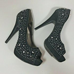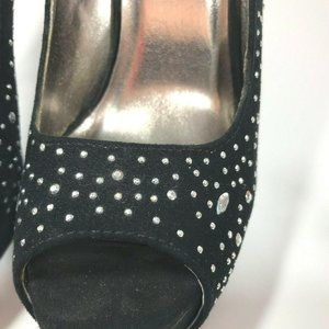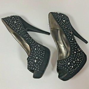 Bongo black suede stilettos with metallic studs - gorgeous platform peep toe, studs add sparkle and style. Pre-owned, only very slight wear, see photos. Size 6