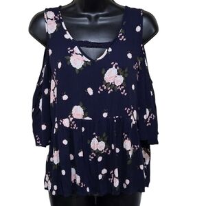 Embrace elegance with this navy floral cold shoulder top. Perfect for any occasion, it features a delicate floral pattern that adds a touch of femininity. Please see pictures for measurements and details. 🌟If you like what you see please checkout my closet. Bundle and save on shipping. Happy Shopping 🛍 😉