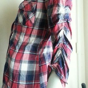 Ruching on back and sleeves. Red, black and white top. Has shimmery stitching. New with tag.