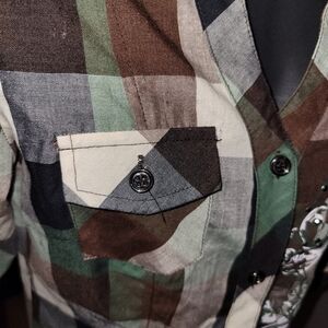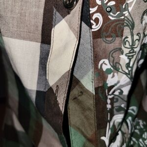 This vintage (early 2000s) Bongo button-down blouse features a unique blend of a brown, green, and black checkered pattern with an abstract floral design for a bold, stylish look. Designed with a V-neckline, 3/4 sleeves, and a flattering fit, it’s a great addition to any wardrobe.