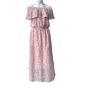 Bongo Womens Maxi Dress Floral Off Shoulder Elastic Waist Lace Trim Pink Size XL