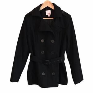 Features: Belted Double Breasted Pea Coat with button epaulets. Single button detail on back. Fully lined.
