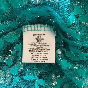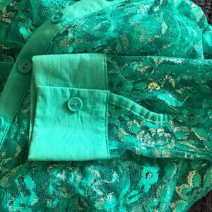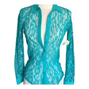 Bongo, women’s button-up, lace shirt, teal lace, silver metallic, Y2K fashion, vintage-inspired, long sleeve, button cuffs, collared shirt, semi-sheer, trendy, retro style, preowned, medium, casual chic, statement piece.