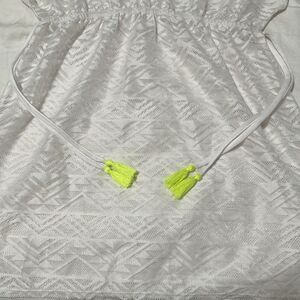 New without tags, never worn swimsuit coverup from early 2000s featuring a white mesh in a geometric pattern, drawstrings at the waist, and neon yellow tassels.