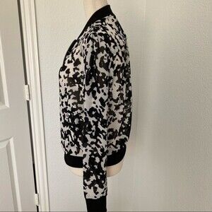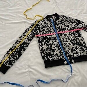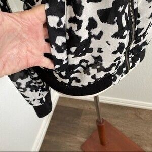 Beautiful Bongo motorcycle bomber biker style jacket in black and white.  One of the hottest new trends is the zebra animal cow print look in fabric!  Very lightweight and luxurious material.  Two pockets.  Front Zipper.  Beautifully tailored.  Perfect for: work, school, date night, party, cocktails, outdoor garden party, BBQ event, rodeo, holiday, glam, resort wear, travel, cruise, vacation, coastal, concert, festival, and any casual day and outfit.