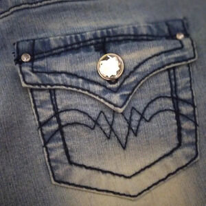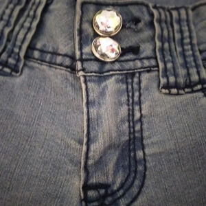 EUC with no defects. Size 5 low-rise shorts with blingy buttons. Flat waist 15" front rise 6 1/2" and inseam 4 1/2". Pretty blue with the light spots.