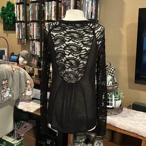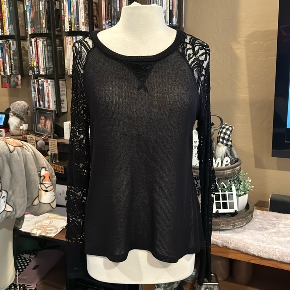 Black sheer sweater with lace sleeves and down the back. Very pretty sweater. From a smoke free but dog friendly home