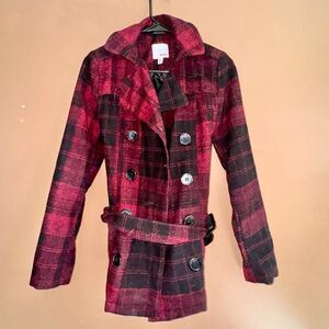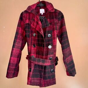 Bongo Women's Double Breasted Red Plaid Button Pea Coat - Size Small
