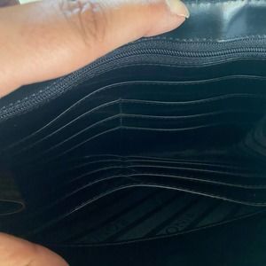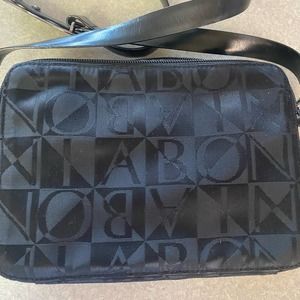 A gorgeous monogram crossbody bag from Bonia. Black on black with a silver B buckle. Some light scratches on B. No notable stains. Small to medium sized.
