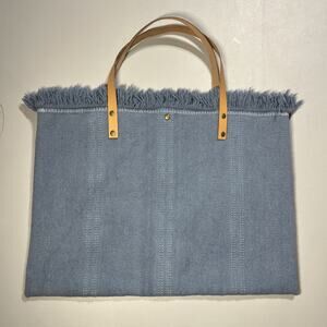 Bonjour Canvas Tote Bag Blue with Fringe Top Boho Summer Beachy Coastal