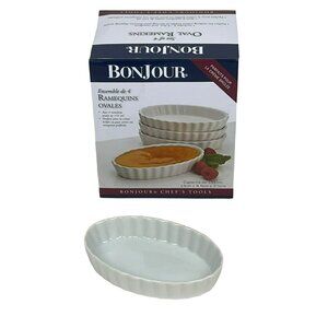 Bonjour Oval Ramekins White 4.5 oz. Set of 4 NEW. 4.5 oz. capacity. Ramekins measure 5" x 3.25" x 1".