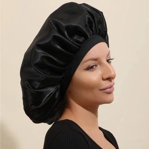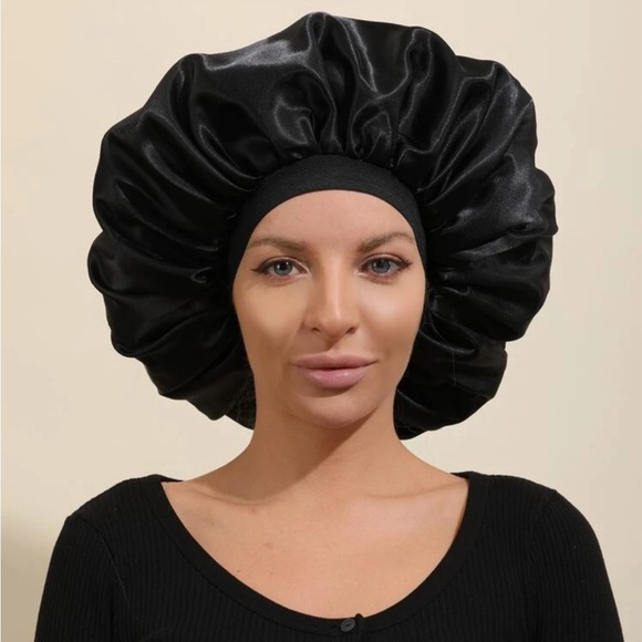 Black, silk encased, bonnet to protect the hair. Silk fabric helps keep curly hair pattern safe, promotes hair growth, keeps the shine and minimizes hair loss. Polyester outside fabric and silk inside for clarification. Crown measures 22-23.6inches