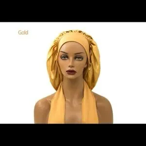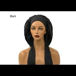 Silk bonnets with jumbo band. Available in pink, purple, red, black, brown, gold, and blue.