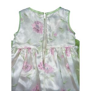 Gorgeous sleeveless party dress. Organza style overlay with embroidered pink flowers with iridescent sequin centers and green embroidered greenery throughout the entire dress.