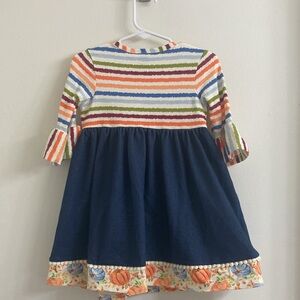 Festive dress for fall with vibrant stripes, orange bow, and pumpkins. Worn only once for Thanksgiving. Excellent used condition. Pet free, smoke free home.