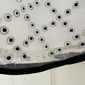 Elegant black velvet top with a white sparkly skirt. Red bow accent at the waist. Perfect for formal occasions, Christmas or the holidays.