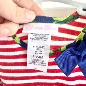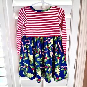 Festive Bonnie Baby girls’ Christmas dress in size 24 months. Long sleeve red and white striped top with bright blue skirt featuring holly, candy canes, and Christmas trees. Accented with a navy blue bow at the neckline. Soft and stretchy knit with a comfortable fit, perfect for holiday photos, parties, or family gatherings. Excellent condition, no flaws noted.