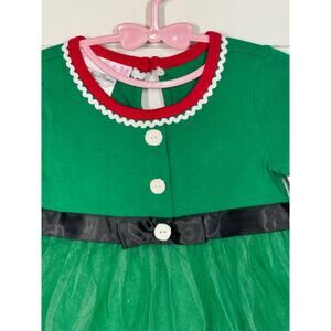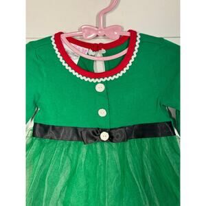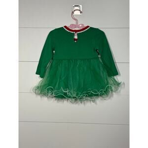 Bonnie Baby girls Christmas Elf green dress with button accents and black belt accent around waist with tulle skirt, size 12 months