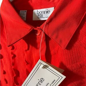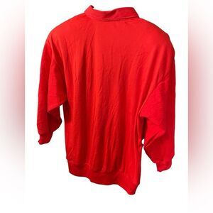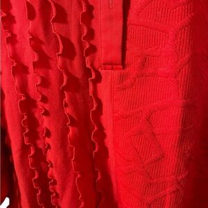 Vibrant red sweater with unique textured design. Features a classic collar and 3/4 sleeves.