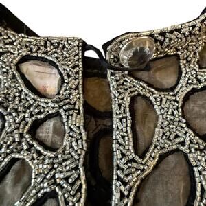• Black knit sweater with rhinestone-studded front and heavily beaded open-lace cutout back