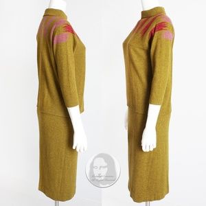 This incredible two-piece ensemble was designed by the most significant American designer of our time, Bonnie Cashin. Made from an incredibly supple mustard-hued cashmere knit, it features an abstract intarsia design in raspberry on the front and in magenta on the back. The matching pencil skirt is lined in mustard silk.