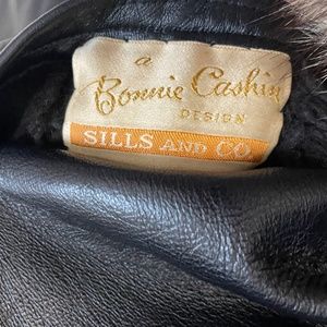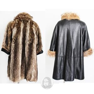 Vintage, preowned & authentic Bonnie Cashin for Sills Reversible Black Leather and Raccoon Fur Coat. It features gorgeous black leather on one side, soft raccoon fur on the other! It fastens with a dog leash fastener at the collar and has deep hip pockets on the leather side.