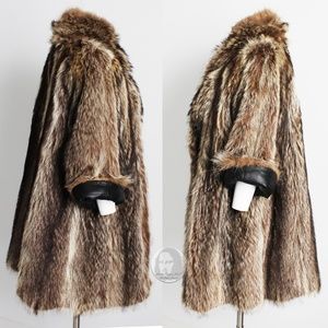 Made in the USA. No size, content or care label; dry clean/furrier clean recommended. No size tag, fits like M. Approximate measurements (taken flat and doubled where appropriate): shoulders - 16in, bust - 40in, waist - 44in, hips - 44in, shoulder to hem - 38in.
