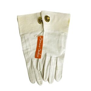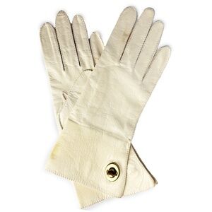 Preowned, vintage Bonnie Cashin for Crescendoe Superb leather gloves, likely made in the late 60s. Made from butter soft creme-hued leather, these incredibly rare gloves feature Bonnie's signature brass turn lock fasteners at the wrist, which keeps them from slipping off, while also adding a chic and stylish design element!