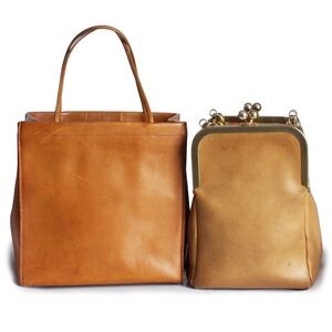 Authentic, preowned, vintage Bonnie Cashin for Coach 'Small Double Header' tote bag with chain straps, likely made in the late 60s. Made from smooth tan harness leather, it features double kiss lock pockets and an open main compartment! The interior sections are lined in Bonnie's signature striped fabric and the bag features gold metal chain straps.