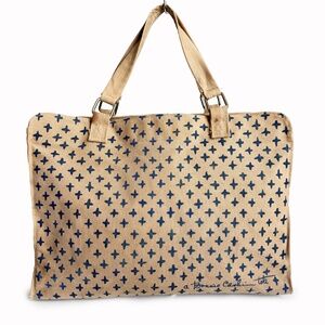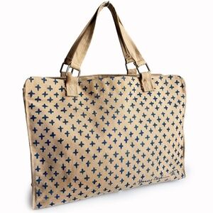 Preowned, authentic vintage Bonnie Cashin for D. Klein large tote bag, likely made in the late 1970s. Made from durable beige twill canvas with a bold blue cross motif and Cashin signature, this rare bag features double top handles and an interior zip pocket with a whimsical printed Cashin message: