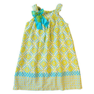 This adorable cotton dress is a girl's size 6 and in great pre-owned condition with no discernable rips or stains! It is green, blue. and yellow with an all-over floral print. It also has a bow on the front and a key hole back with button closures at the neck. Please see photos for close-ups and tag information!
