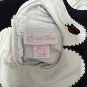 Long-sleeve onesie white with blue trim on wrists and collar with a ladybug applique on collar. Navy corduroy overalls dress with plaid attached ribbon around waist and appliques of birds, flowers and ladybug. Can be separated.