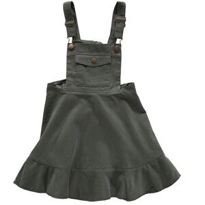 Olive corduroy jumper with front pocket on bib, self ruffle hem and fun overall shoulder straps