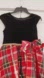 Charming plaid dress with layered skirt. Features a black velvet bodice. Perfect for special occasions.