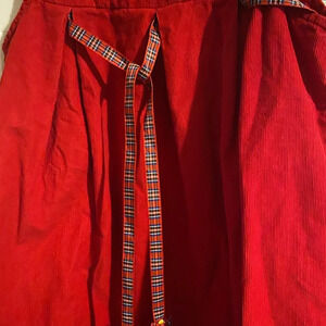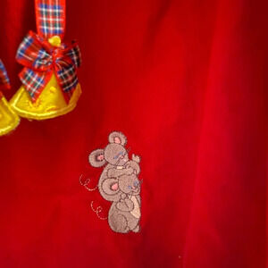 Red corduroy jumper with embroidered cats 🐈 at top. Hem has embroidered mice 🐭