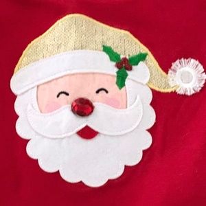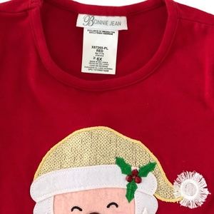 Bonnie Jean Holiday Outfit. Red tunic top with red stripes and green and red polka dots. Appliquéd Santa face on front. Matching red stripe leggings with ruffled polka dot trim.