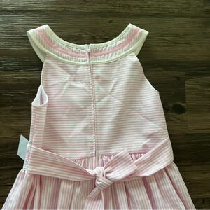 DETAILS: Bonnie Jean girls dress size 12. Pink and white stripe with shimmery silver metallic thread. Bow waist detail, back tie, lined. Poly rayon blend, machine wash.