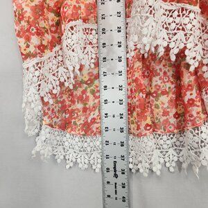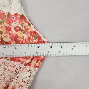 This cute dress is in excellent condition. Clean, well cared for. Top is tank style with ivory lace overlay, lace at elastic waist, lace around high low hem. Orange, red and yellow floral pattern.