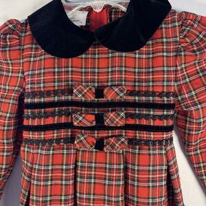 Beautiful Bonnie Jean girls holiday dress in classic red plaid with a soft black velvet Peter Pan collar and matching velvet ribbon trim. This timeless, vintage-inspired style is perfect for Christmas photos, church events, or holiday gatherings. Fully lined with back zip closure and long sleeves.