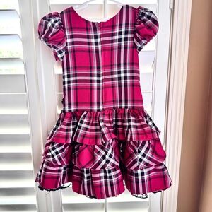 Adorable Bonnie Jean girls’ holiday/party dress in vibrant pink and black plaid with short puff sleeves. Features a tiered ruffle skirt, black satin waistband with ruffle trim, and tulle underskirt for extra volume. Perfect for Christmas, holiday photos, or any special occasion. Zip back closure. Size 5. Excellent condition with no flaws noted.