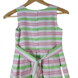 Bonnie Jean White Pink Green Stripe Sleeveless Dress Spring Back Zipper Close Pink Bow Wide Pleat Skirt. Excellent pre-owned condition with no stains or tears.