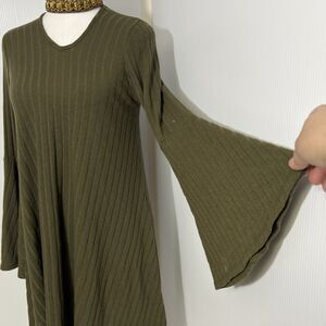 Trendy olive green ribbed knit dress with boho bell sleeves